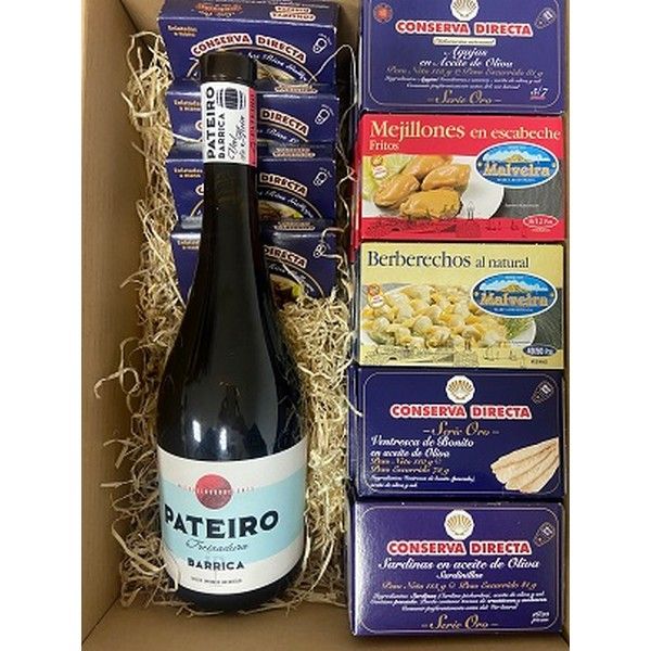 LOTE REGALO NUM.21 Botella Ribeiro Pateiro Barrica Prod. Limitada 75 cl4 Latas de Zamburiña en Salsa de Vieira RO-120, Conserva Directa.4 Latas de Mejillones en escabecha OL-120, Conserva Directa.4 Latas de Ventresca de Bonito en Aceite de Oliva RR-125, Conserva Directa.4 Latas de Sardinilla en Aceite de Oliva 16/20 piezas, Conserva Directa.4 Latas de Aguja en Aceite de Oliva, Conserva Directa.4 Latas de Berberechos al natural 40/50 piezas RR-120, Malveira